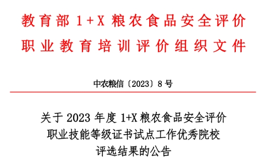 根据《关于2023年度1+X粮农食品安全评价职业技能等级证书试点工作优秀院校评选结果的公告》,公司荣获2023年度1+X 粮农食品安全评价职业技能等级证试点工作优秀院校、优秀团队团队奖、优秀组织奖。