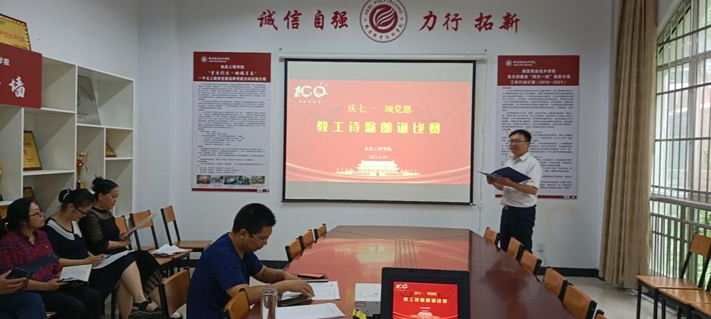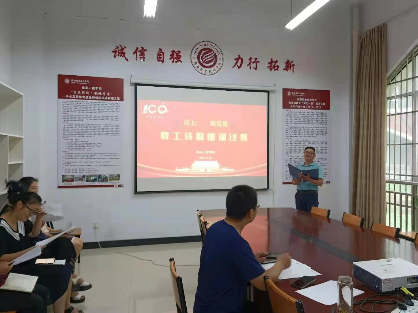 为庆祝中国共产党建党100周年,讲述中国共产党 100年光辉历程和取得的伟大成就,弘扬和讴歌中华民族的伟大胜利,激发全院教职员工爱党、爱国的民族情怀,增强集体荣誉感,推进学院文化建设,6月30日下午,食品工程公司党总支“庆七一 颂党恩”教工诗歌朗诵比赛在党员活动室举行。