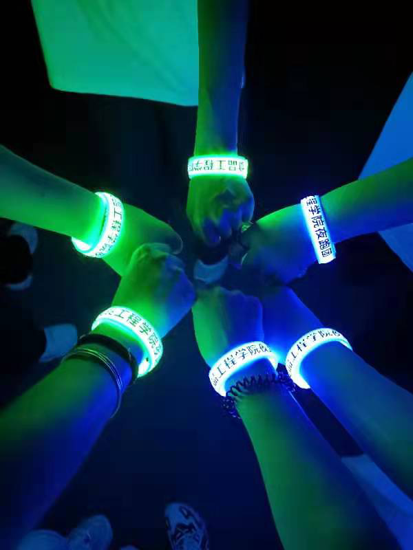 当晚8:30,同学们如约在玉兰园操场集结,随着指令的发出,同学们踏着整齐的步伐,手带荧光手环,边跑边挥动着统一的手势,把整个操场装点成一个荧光闪耀的欢乐海洋,涌动的人群在跑道上形成了一道亮丽的风景线。