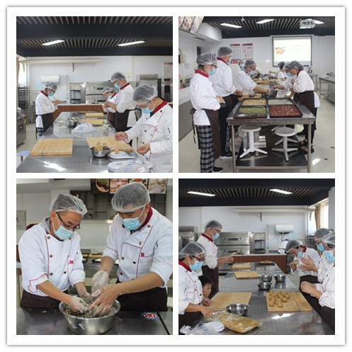 下午2点,betway官网教职工齐聚烘焙实训室,分工会主席葛培运对教职工热情的节日祝福之后,老师们兴致勃勃地开始做月饼。在郝慧敏老师的指导和示范下,从配料选取、饼皮制作,到馅料和饼皮称重,再到包馅、压模成型,老师们都严格流程,精心制作。