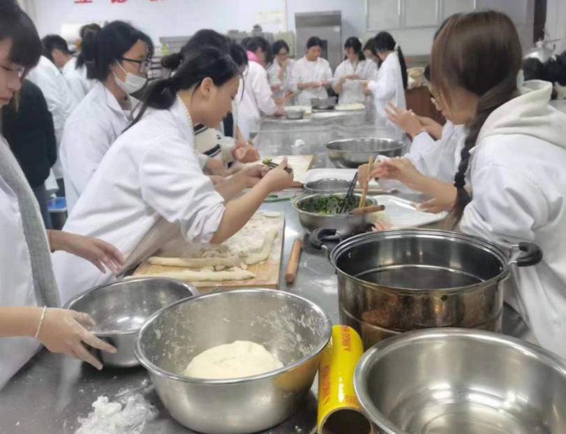 活动伊始,同学们早早来到了实训室开始忙碌,摘菜、剁馅、和面等忙的热火朝天。包饺子过程中,同学们自动分工协作,你擀皮,我包馅,笑语不断,情绪高涨,同学们用自己拿手的方法包着各式各样的饺子,大家切磋包饺子的技巧,现场洋溢着满满的“家”的味道,处处是温馨的景象,一盘盘热气腾腾的饺子出锅了,大家围坐在一起共同品尝着亲手包的饺子。