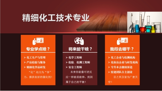 专业概况:精细化工技术专业经过十余年建设,至今已初具规模。该专业团队力量雄厚,现有专兼职教师20人,兼职教师6人,专职教师14人。高级职称12人,“双师型”教师占90%。本专业办学条件优越,实训基地建筑面积近1000m2,设备总值500余万元。目前建有理化检验实训室、品质检验实训室、精密仪器分析室、原子吸收检测实训室等实训室。现拥有原子吸收分光光度计、气相色谱仪、红外光谱仪、高效液相色谱仪、物性仪等分析仪器,拥有高速台式冷冻离心机、旋转蒸发仪等实训设备等。并实现了实训室多媒体教学与安全监控全覆盖。在校生第三学年可报考专升本,毕业生可考取相应职业资格证书。
