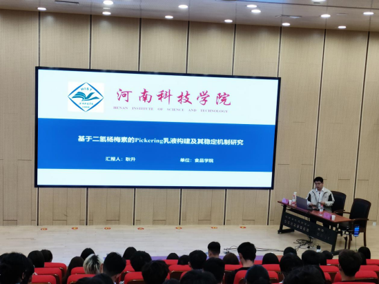 4月14日下午,“鹤职院美好食光”大讲堂第三十期报告会在学院一号报告厅举行。邀请河南科技学院耿升博士作了题为《基于二氢杨梅素的Pickering乳液构建及其稳定机制研究》的报告。学院师生160余人现场参加报告会并通过腾讯会议在全校直播,报告会由食品工程公司党政综合办主任王永刚主持。