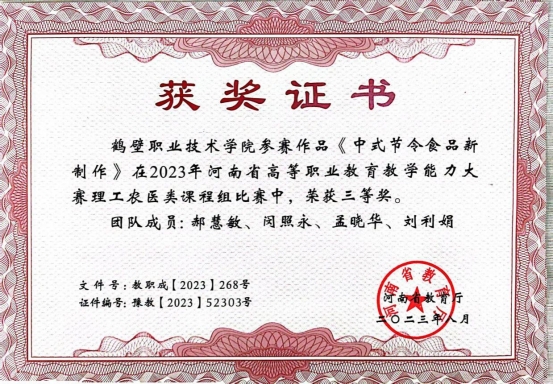 14、河南省高等职业教学能力比赛《中式节日食品新制作》三等奖