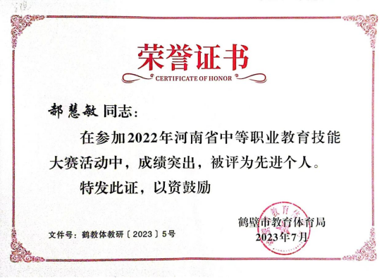 河南省中等职业教育技能大赛优秀指辅导老师奖 |