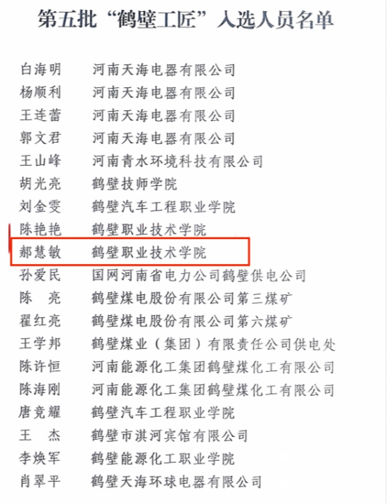 近日,中共鹤壁市委组织部、鹤壁市总工会、鹤壁市人力资源和社会保障局联合公布了第五批“鹤壁工匠”入选人员名单。经过学校工会推荐、鹤壁市总工会初审、鹤壁市人力资源和社会保障局组织专家评审、鹤壁市人才工作领导小组会议审定,公司郝慧敏老师成功入选为2023年度“鹤壁工匠”。